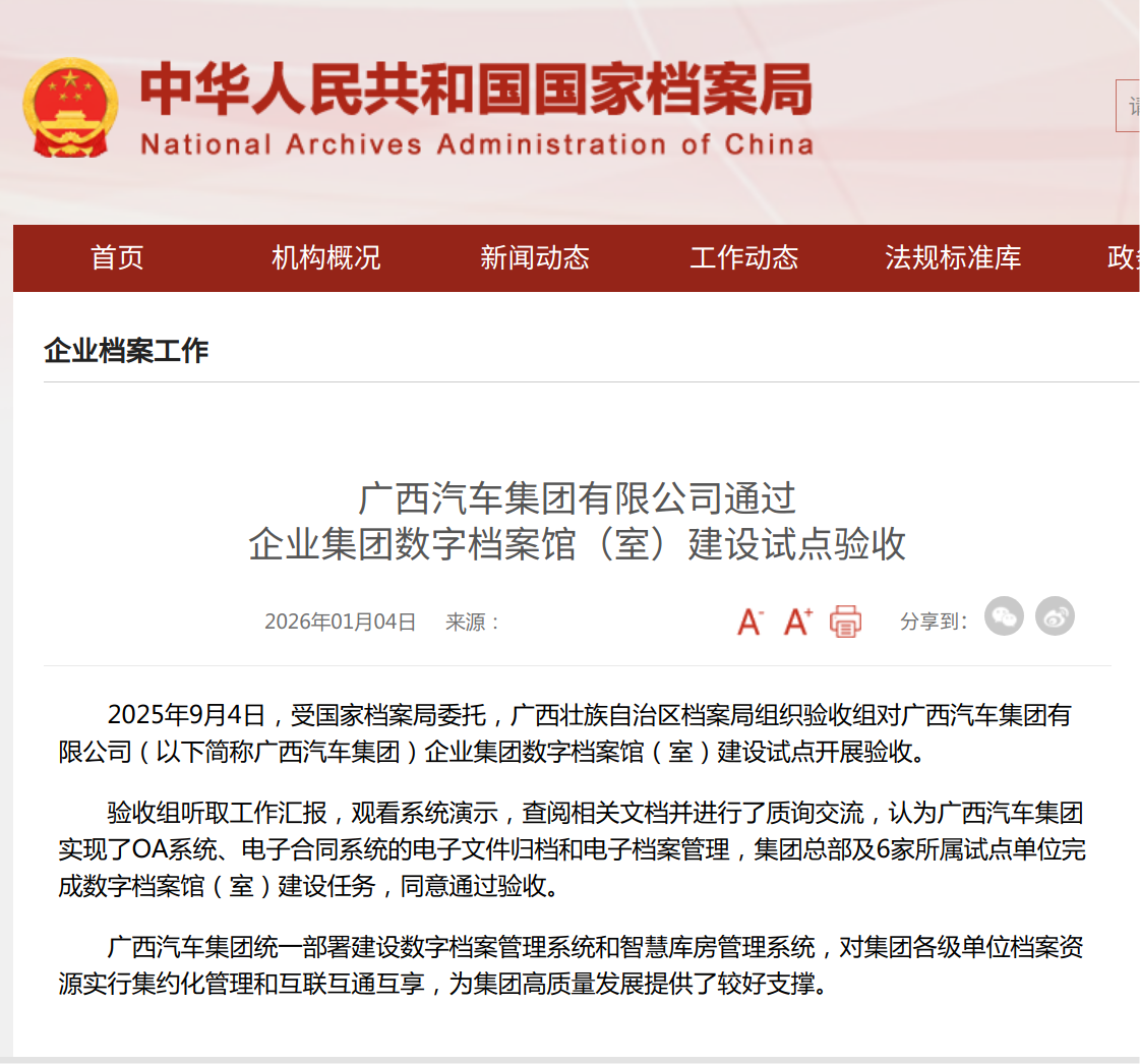 開年好消息!國家檔案局:廣西汽車集團(tuán)通過此項驗收