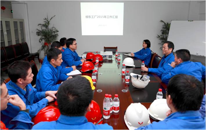 ? ??隨后,韋董一行來(lái)到公司柳東工廠進(jìn)行調(diào)研,在參觀生產(chǎn)現(xiàn)場(chǎng)后與柳東管理團(tuán)隊(duì)進(jìn)行座談。柳東工廠廠長(zhǎng)黃輯匯報(bào)了2015年柳東工廠運(yùn)行情況及2016年業(yè)務(wù)突破。