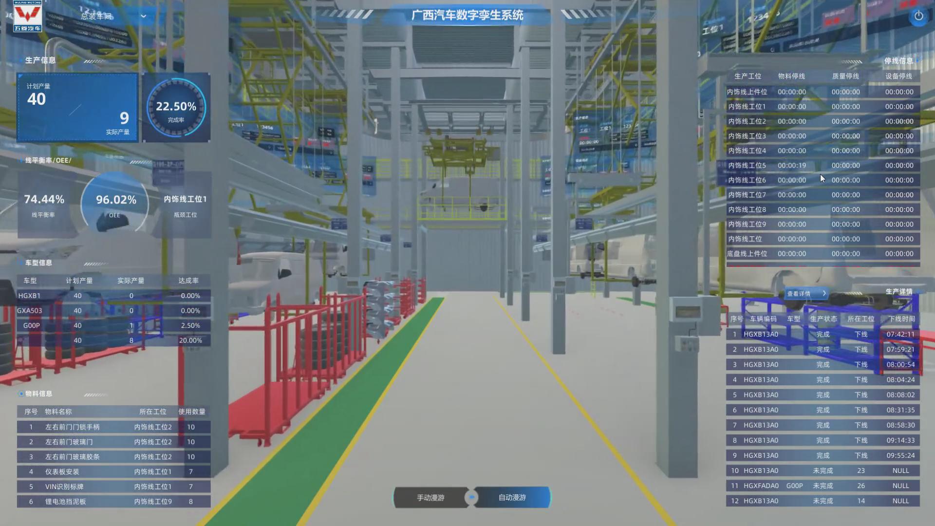 生產(chǎn)線、AGV小車、五菱物流車……在廣西汽車集團(tuán)專用車生產(chǎn)車間內(nèi)所有存在的工業(yè)元素,全部呈現(xiàn)在大數(shù)據(jù)屏幕前,虛擬3D模型完美復(fù)制了一模一樣的車間,全程動(dòng)態(tài)漫游、巡檢生產(chǎn)現(xiàn)場(chǎng)。該“工業(yè)+互聯(lián)網(wǎng)”的技術(shù)應(yīng)用,源自廣西汽車集團(tuán)數(shù)字孿生項(xiàng)目,項(xiàng)目已列入工信部國家級(jí)的工業(yè)互聯(lián)網(wǎng)創(chuàng)新項(xiàng)目,現(xiàn)在正式進(jìn)入落地試運(yùn)行階段。